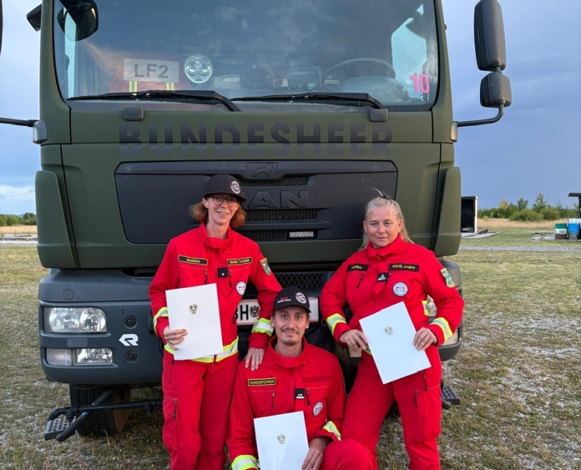 Unsere Hundeführer:innen Stefan Bretterklieber, Irmgard Pölzl und Alexandra Travljanin stellten sich dieser Herausforderung und nahmen vom 07. – 11. Juli im ABC-Abwehrzentrum sowie am ABC- & Katastrophenhilfsübungsplatz Tritolwerk an dieser Ausbildung teil.