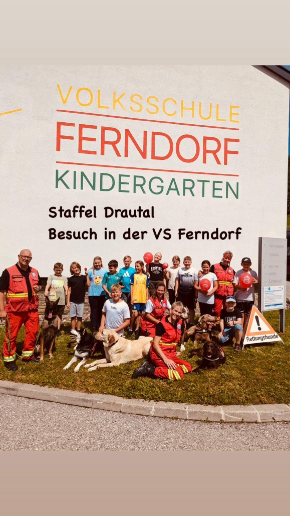 Die Staffel Drautal besuchte die Volksschule in Ferndorf. Die Kinder zeigten sich sehr interessiert an der Tätigkeit der ÖRHB und auch, wie die Ausbildung eines Rettungshundes abläuft. Zum Schluss gab es noch eine Vorführung, wo das theroretisch Erlernte in der Praxis gezeigt werden konnte.