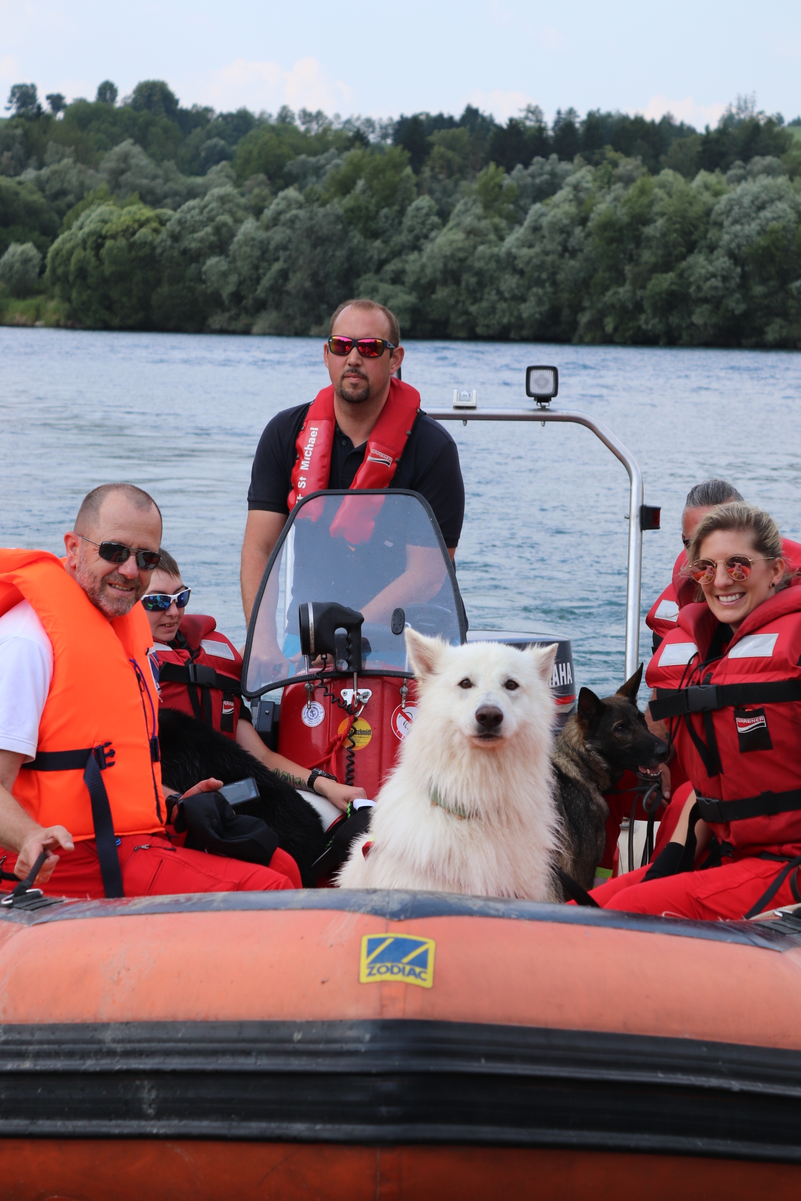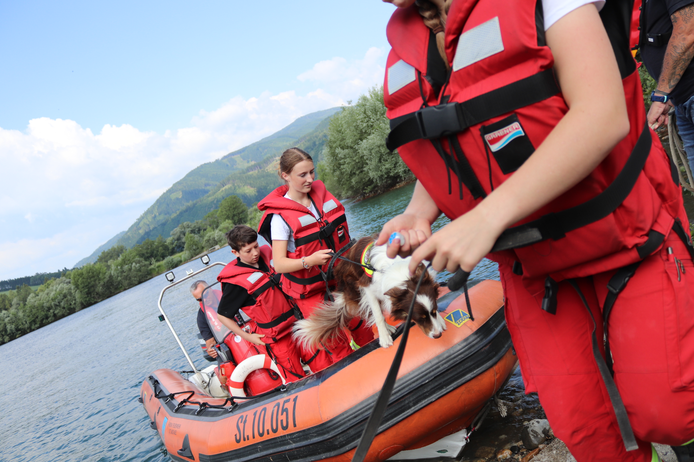 Die Kolleg:innen der Feuerwehr St. Michael boten den Rettungshundeteams Bootsfahrten auf dem Schotterteich an und sorgten für eine willkommene Abkühlung bei den sommerlichen Temperaturen, die den ganzen Lehrgang über herrschten.
