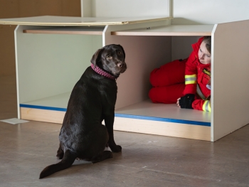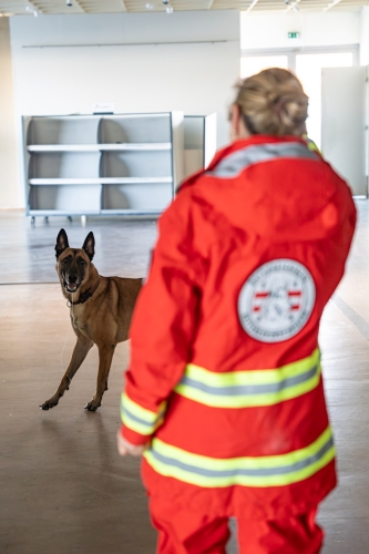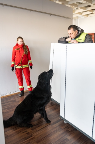 Nicht nur im Wald, Wiesen und auf Feldern, sondern auch in großen Gebäuden müssen unsere Rettungshunde in der Lage sein, konzentriert und zuverlässig Räume, Flächen und Keller nach vermissten Personen abzusuchen. Dunkelheit, glatte Böden, große Schränke, Truhen oder auch die spezielle Akkustik sind Herausforderungen, mit denen speziell junge Hunde erst lernen und trainieren müssen, um im Ernstfall gut vorbereitet zu sein.