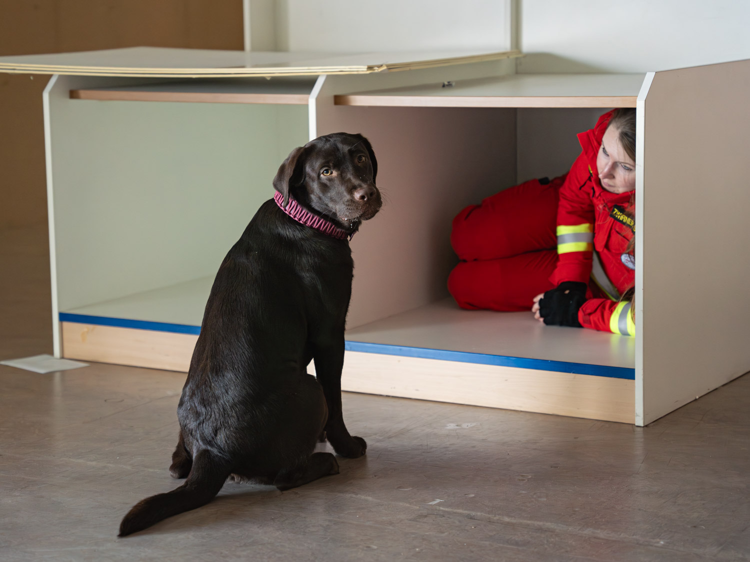 Nicht nur im Wald, Wiesen und auf Feldern, sondern auch in großen Gebäuden müssen unsere Rettungshunde in der Lage sein, konzentriert und zuverlässig Räume, Flächen und Keller nach vermissten Personen abzusuchen. Dunkelheit, glatte Böden, große Schränke, Truhen oder auch die spezielle Akkustik sind Herausforderungen, mit denen speziell junge Hunde erst lernen und trainieren müssen, um im Ernstfall gut vorbereitet zu sein.