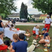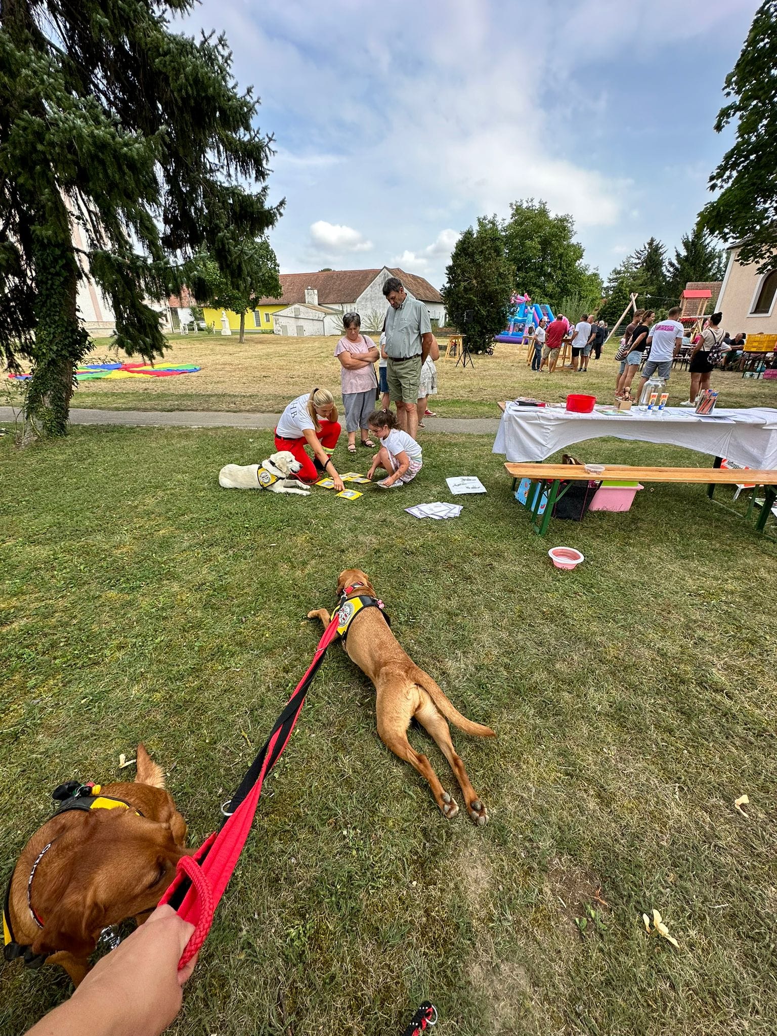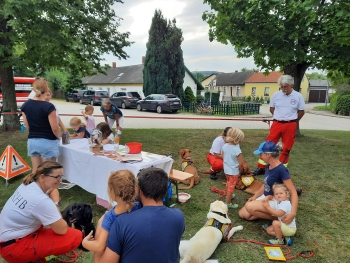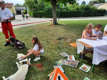 Am 27. August 2023 durfte die Staffel Hollabrunn bei der Eröffnung des Spielplatzes in Großstelzendorf dabei sein. Nach der Segnung des Spielplatzes durch den Pfarrer der Gemeinde, haben sie eine Station für Kinder betreut, wo man neben Hundestreicheln viel über die Körpersprache des Hundes lernen konnte. Zudem durften die Kinder Bilder aus Lachspastete malen, welche die Hunde dann abschlecken durften. Das hat unseren Hunden wohl am meisten Spaß gemacht.