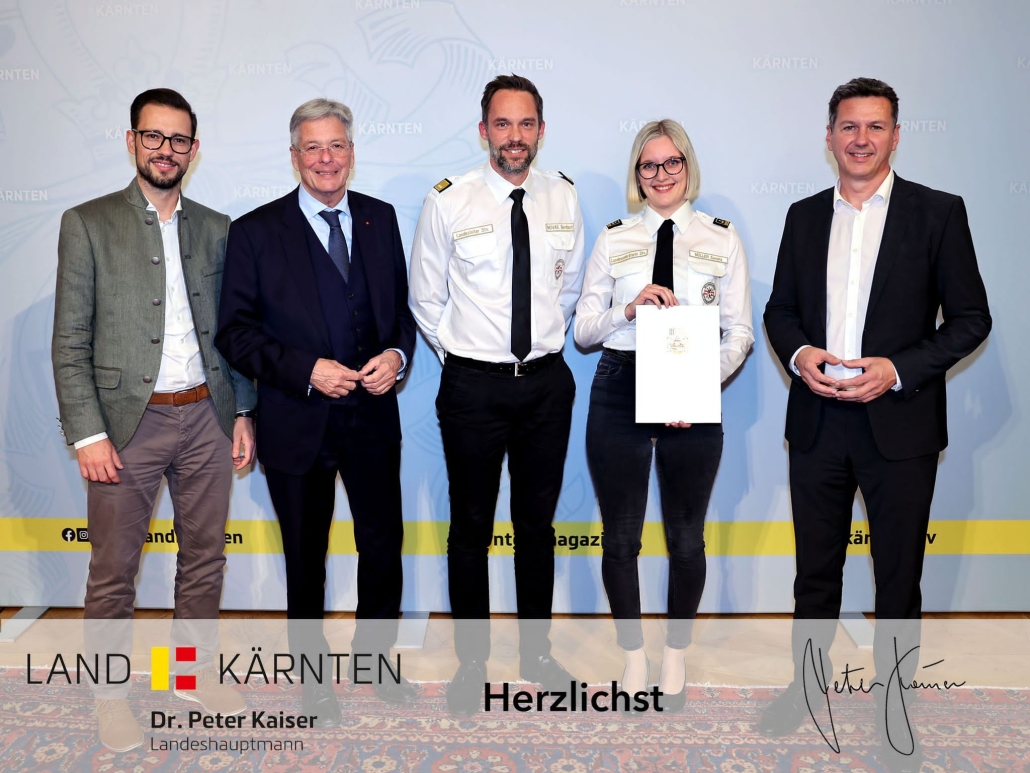 Der „Tag der Einsatzkräfte“ fand heuer erstmalig im Spiegelsaal der Kärntner Landesregierung statt, wo seitens der Landesleitung Bernhard Novak und Sandra Müller teilnahmen. Bei diesem Anlass wurden Kolleg*innen von verschiedenen Einsatzorganisationen für außergewöhnliche Leistungen geehrt. Für die Landesgruppe Kärnten wurde Meggi Augustin nominiert, welche am 01.01.2024 die Staffel Klagenfurt neu gegründet hat.