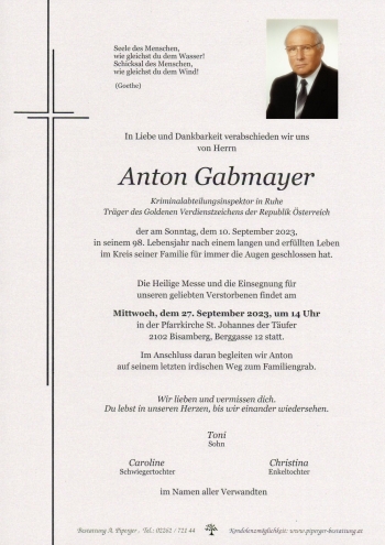 Unser Gründungs- und Ehrenmitglied der Österreichischen Rettungshundebrigade, Anton Gabmayer, ist im 98. Lebensjahr verstorben.